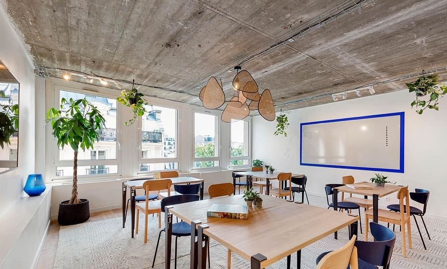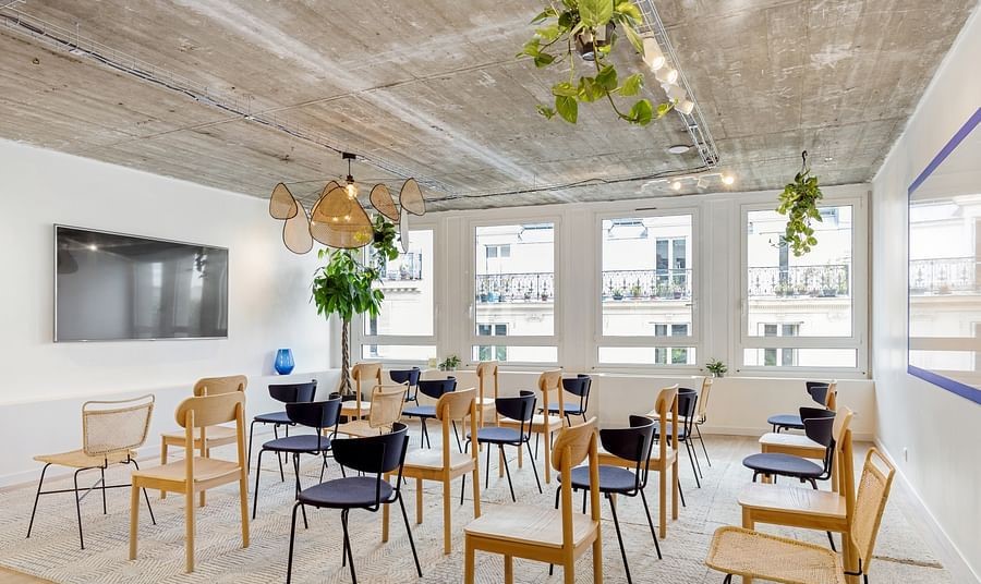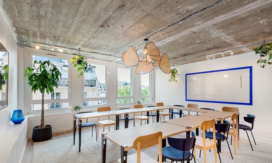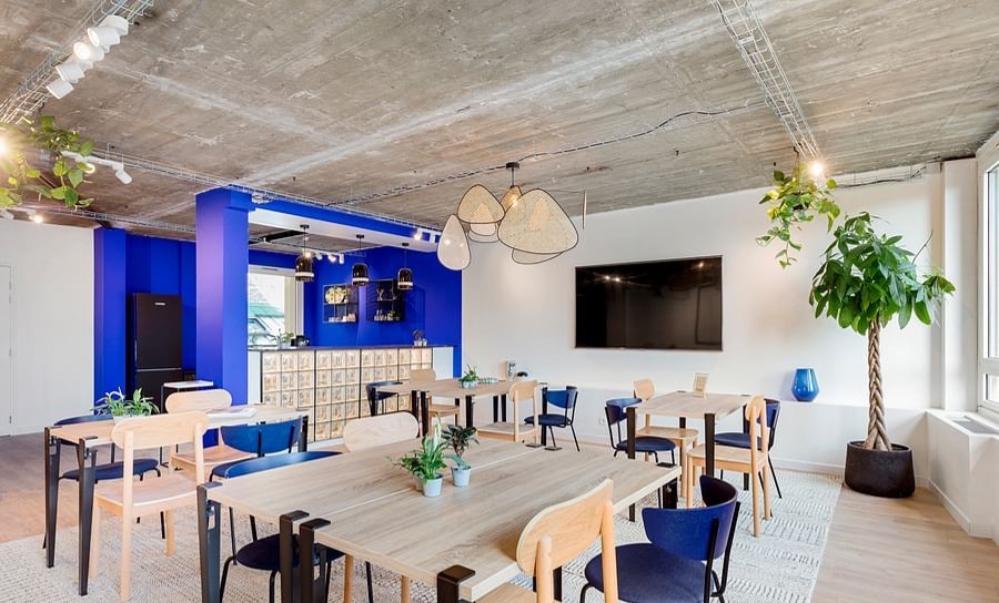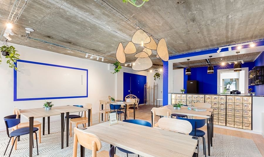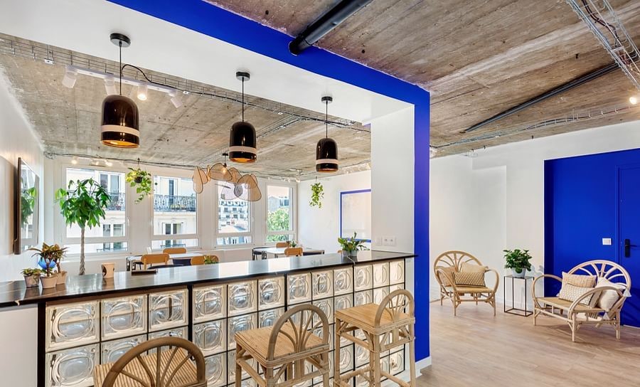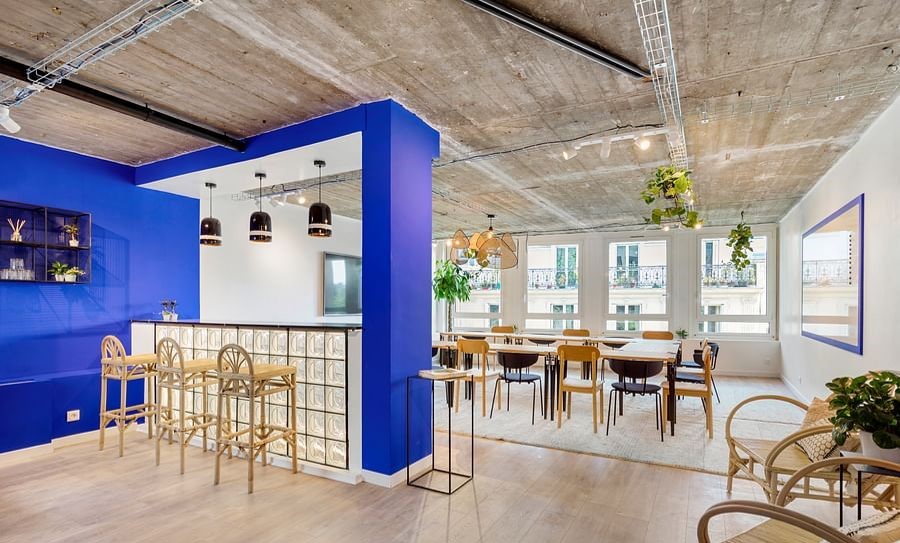 Un bleu électrique signé Yves Klein, un style brutaliste assumé, un comptoir en verre inspiré de Pierre Chareau… Située à deux pas des Champs-Elysées, cette salle de réunion de 60 m² est marquée par l’inspiration architecturale pour l’organisation de vos événements professionnels.