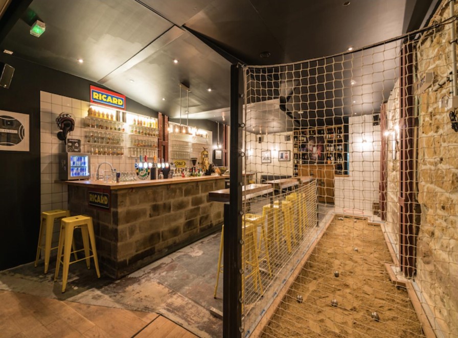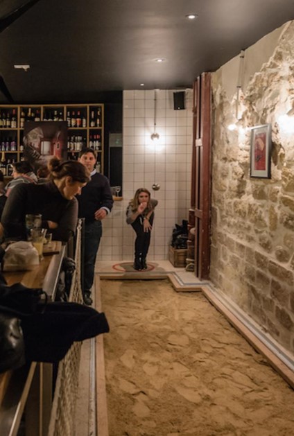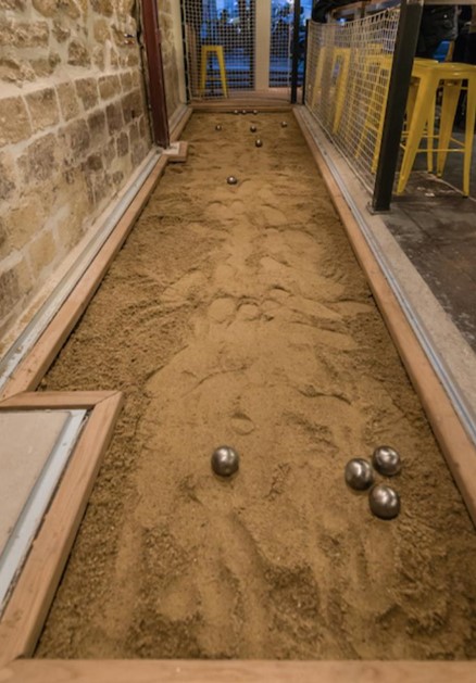 DANS SES RESTOS, ALEXIS A INSTALLÉ UN TERRAIN DE BOULE À CÔTÉ DU BAR OÙ ON POINTE ET MET DES CARREAUX, OÙ ÇA BRAILLE ET SE TAPE DANS LE DOS.